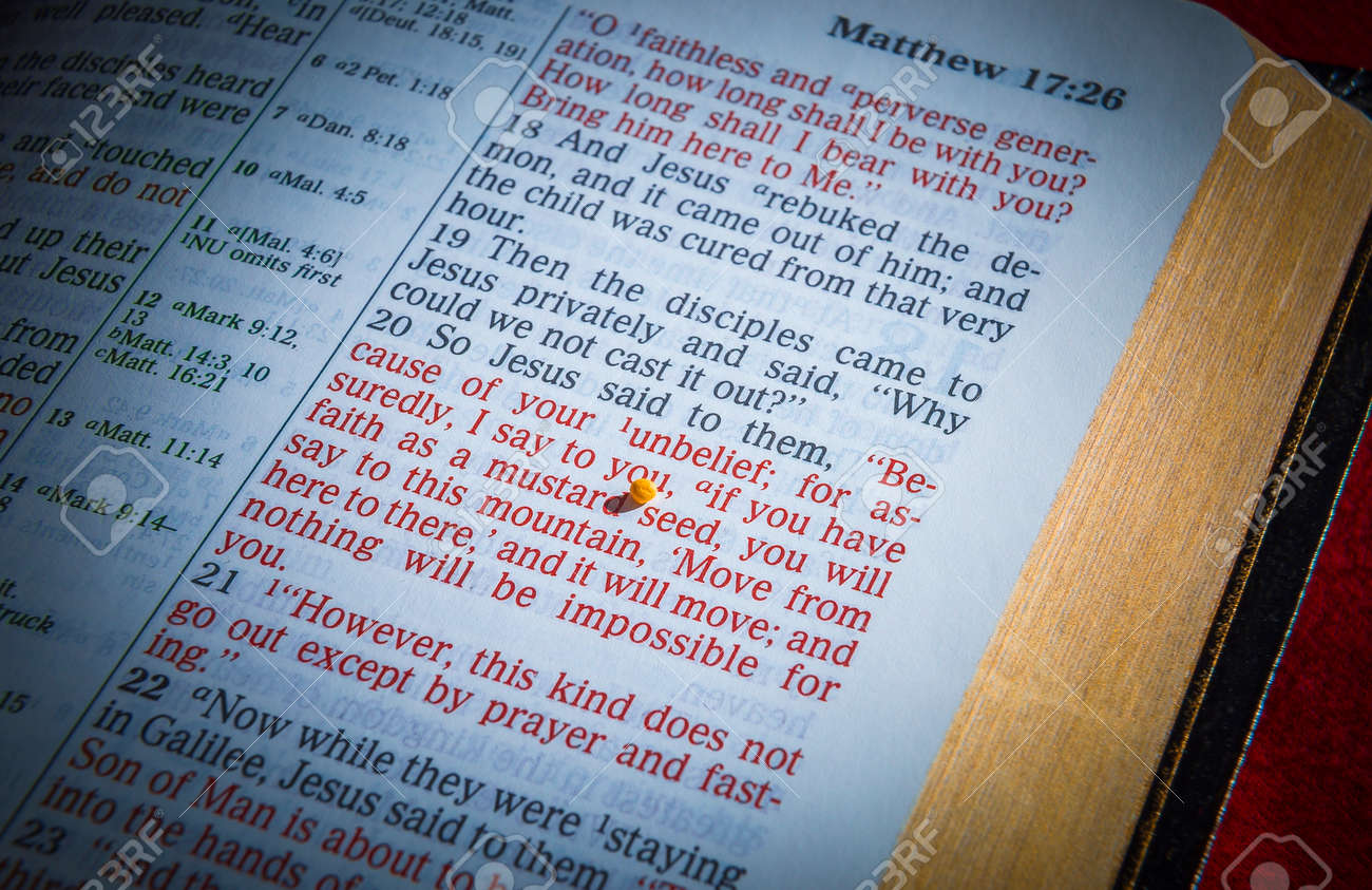 Mustard Seeds On A Open Bible Page Illustrating The Verse If