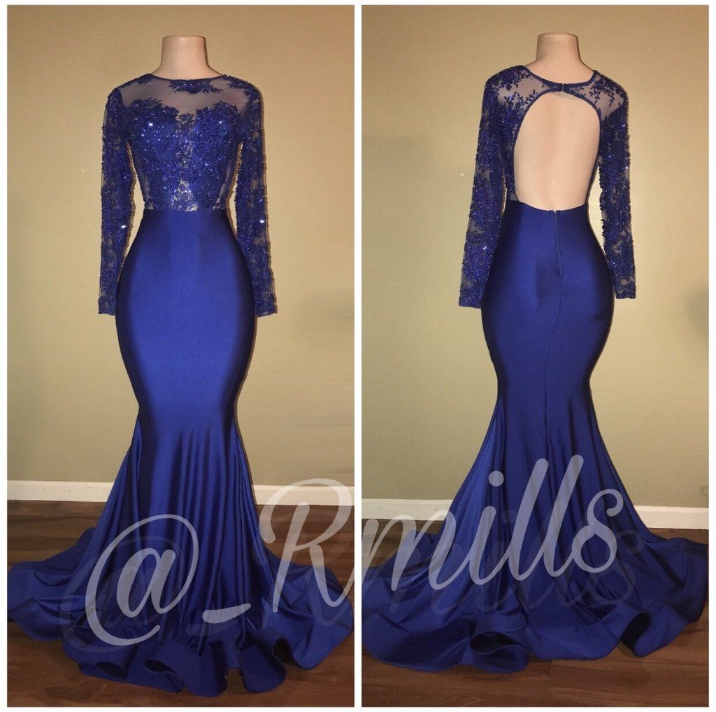Royal Blue Lace Long Sleeve Mermaid Prom Dress With Open Back