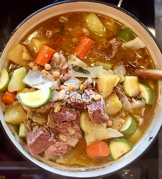 Caldo de res made with beef shanks potatoes corn and vegetables.