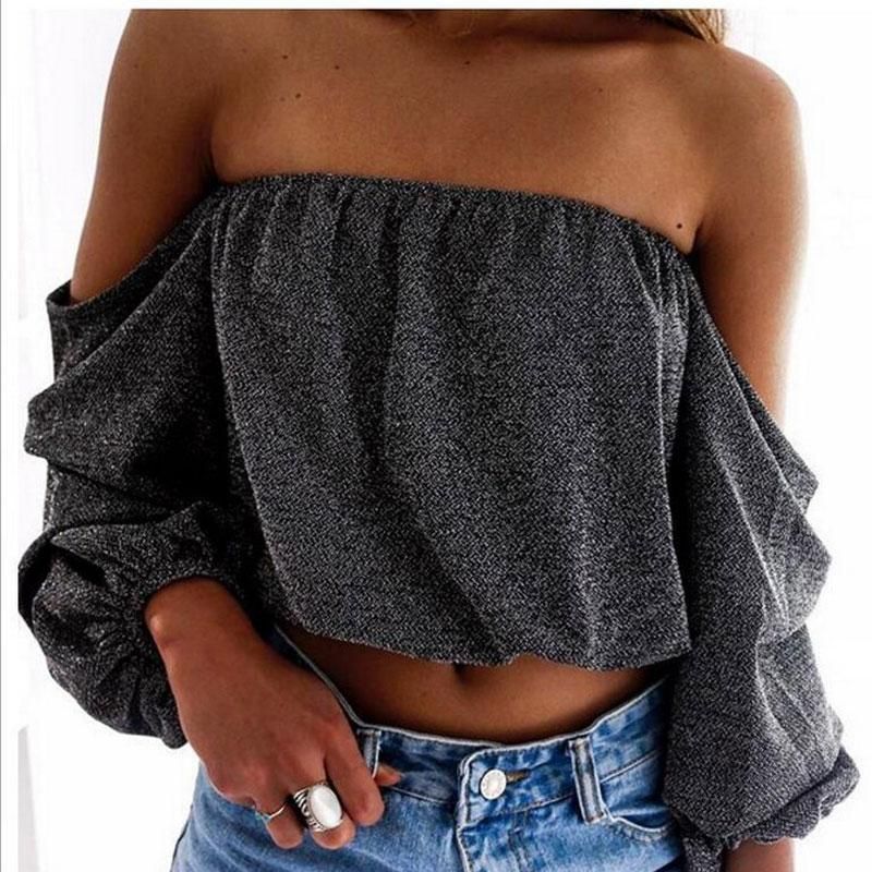 Womens Long Sleeved Summer Sexy Casual Slash Neck Crop Tops Off The